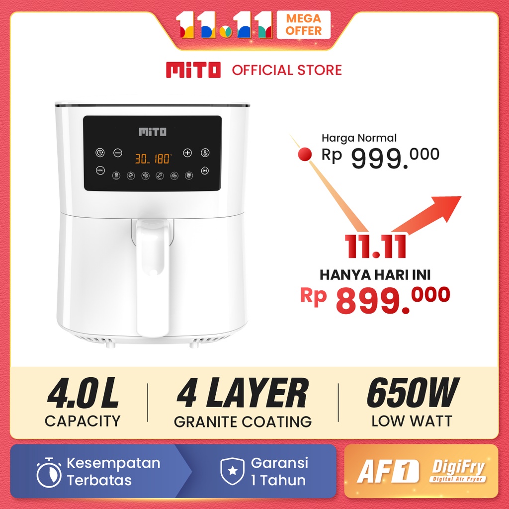 HANYA HARI INI DISKON MITO Digital Air Fryer AF1 Low Watt 4L Mesin Penggoreng Tanpa Minyak - White